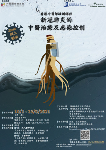 課程共有四節課,包括兩節中醫藥防治新冠肺炎及兩節現代醫學的感染控制知識。課程目標為更新中醫師對感染控制認識,為中醫診所提供合適防護裝備的建議; 加深中醫師對新冠肺炎的中西醫認識、疑似個案的呈報及轉介機制,協助衛生署在前線防止疫情的散播;藉網上視像教學,拓展新型的中醫師培訓方式,豐富業界的進修途徑。