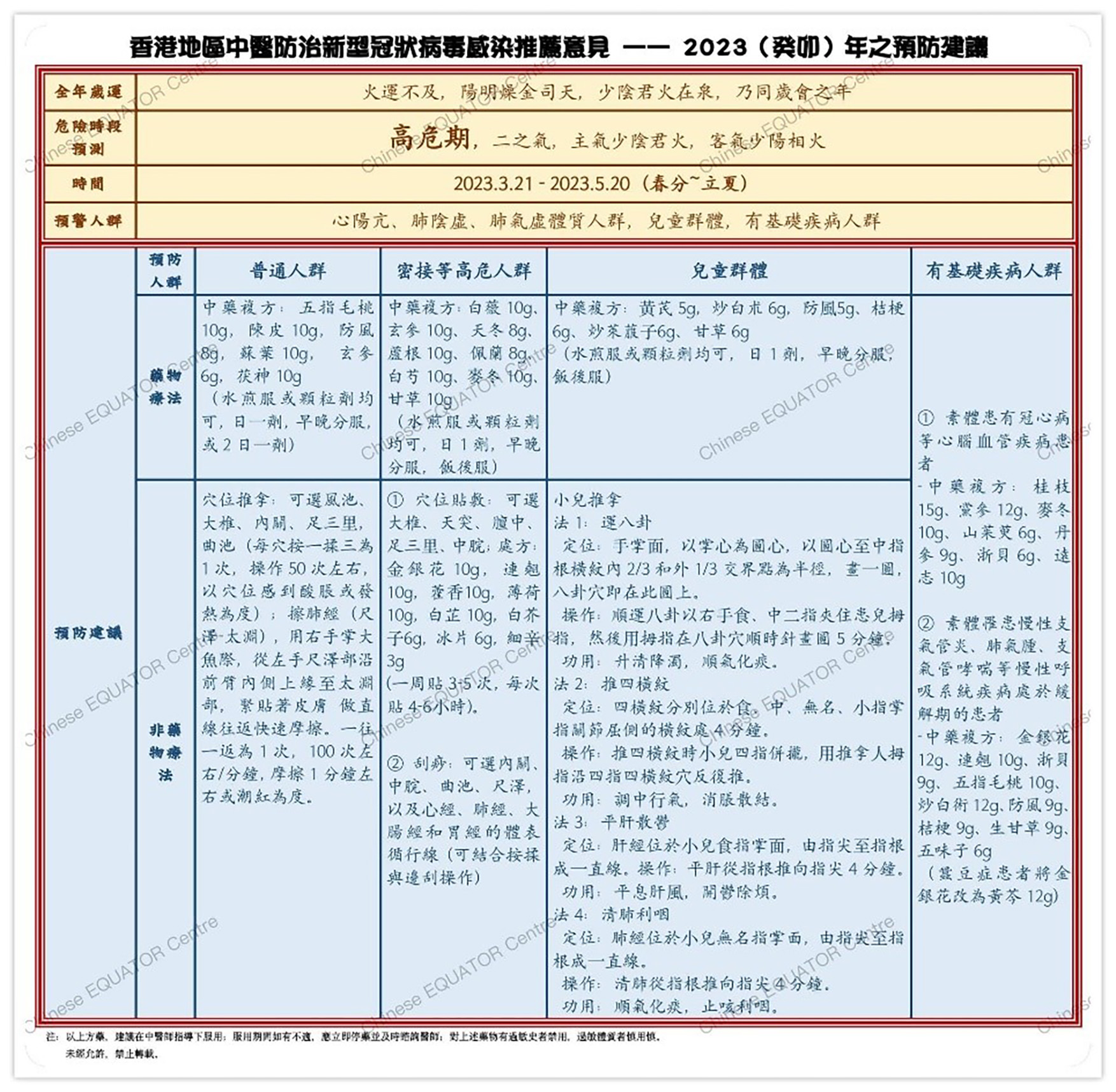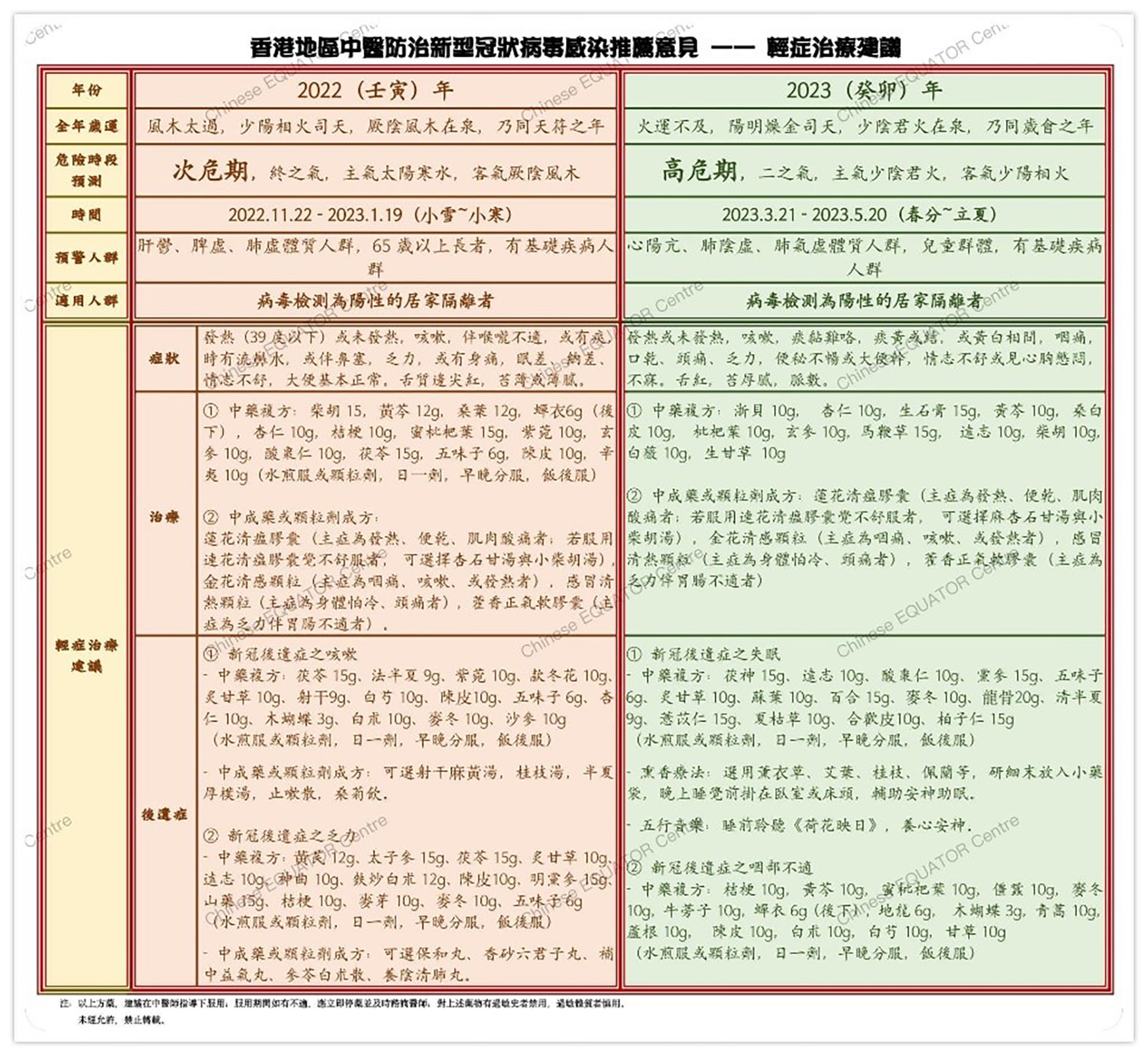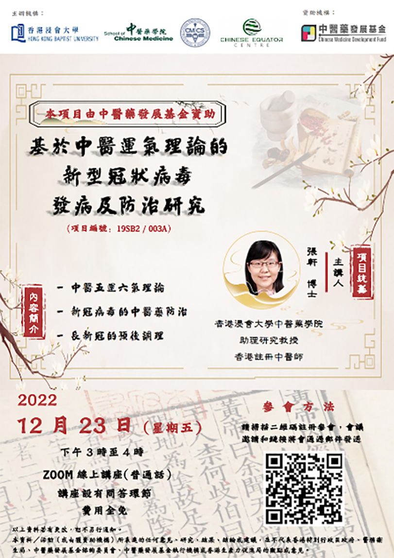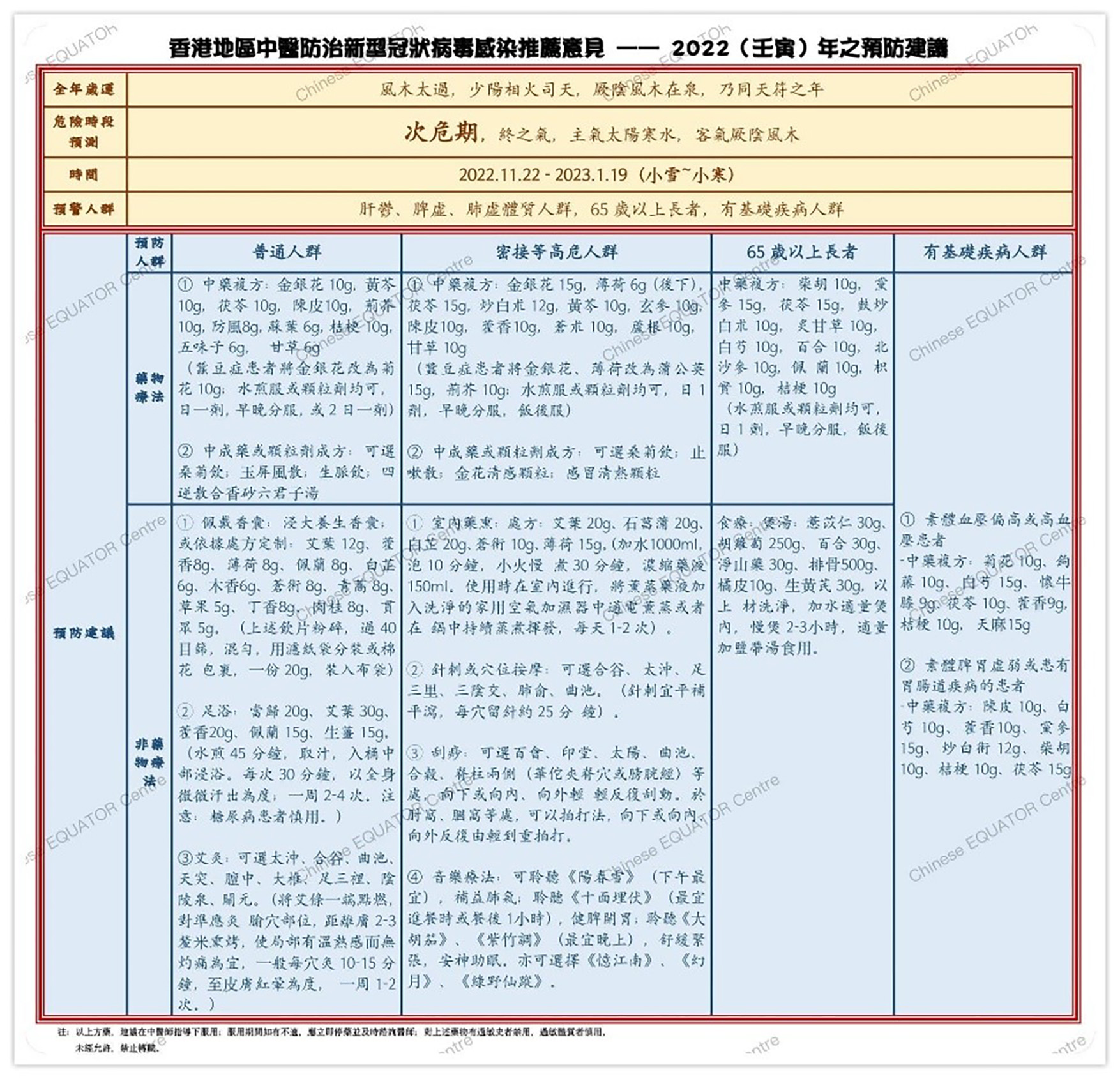 3. 基於上述研究結果及來自本港、北京、天津等地區的專家問卷調查與意見咨詢(包括:運氣領域專家、《黃帝內經》的專家、新冠康復臨床研究者、治療新冠的一線臨床醫師等),項目最終形成了基於中醫傳統智慧—五運六氣理論的《香港地區2022年冬-2024年中醫防疫推薦意見》。該《意見》是首個從中醫運氣角度預測新冠病毒感染在本港未來3年間進行預防與治療(含康復期,後遺症)的研究預案,其中專門提出了傳染病易於反復/波動的危險時段,分為高危、次危、低危及平和不同等級,預警了易感人群,並有針對性地提出預防、輕症治療及康復調理的中醫推薦意見。例如:在預防方面,《意見》中列出來了關於普通人群、密接高風險人群、65歲以上長者、兒童、孕婦、素體體質偏頗以及素體患有基礎疾病人群的預防策略,包含中藥複方治療及中醫適宜技術;在長新冠治療方面,針對咳嗽、咽喉不適、乏力、失眠、腦霧、情緒問題(抑鬱/焦慮/疑病症)、大便不調(便秘或腹瀉)、皮膚病、肢體痛症等常見後遺症提出了因時制宜處方。