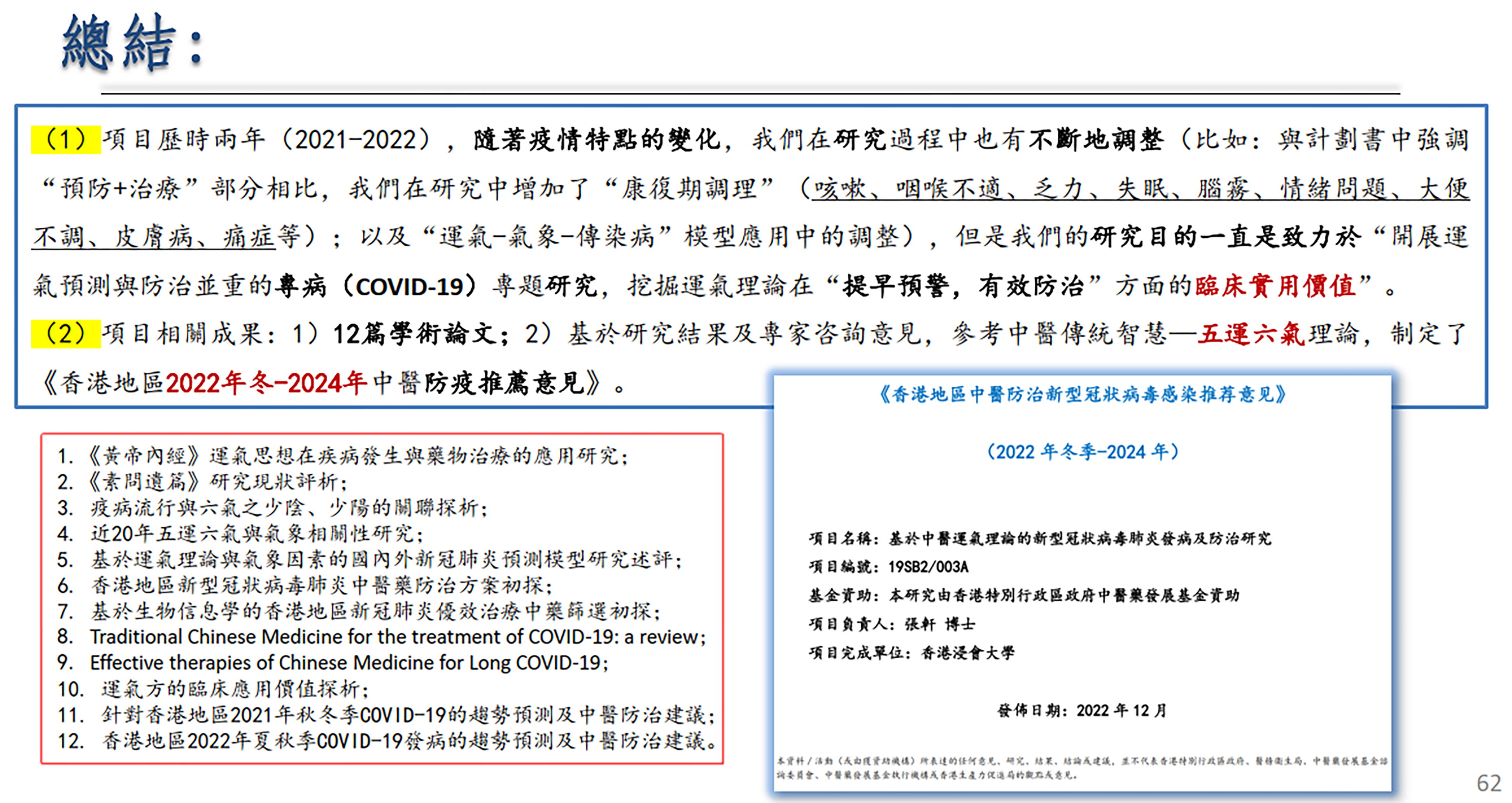 該項目是在本港地區開展的首個基於運氣預測與防治並重COVID-19傳染病專題研究,相關研究結果已整理成10餘篇文章(詳見項目論文匯編冊)。截至目前,已有部分公開發表在《中華中醫藥雜誌》、《中國中醫基礎醫學雜誌》、《中醫藥學報》、《香港中醫雜誌》、《遼寧中醫雜誌》等國內核心期刊上。