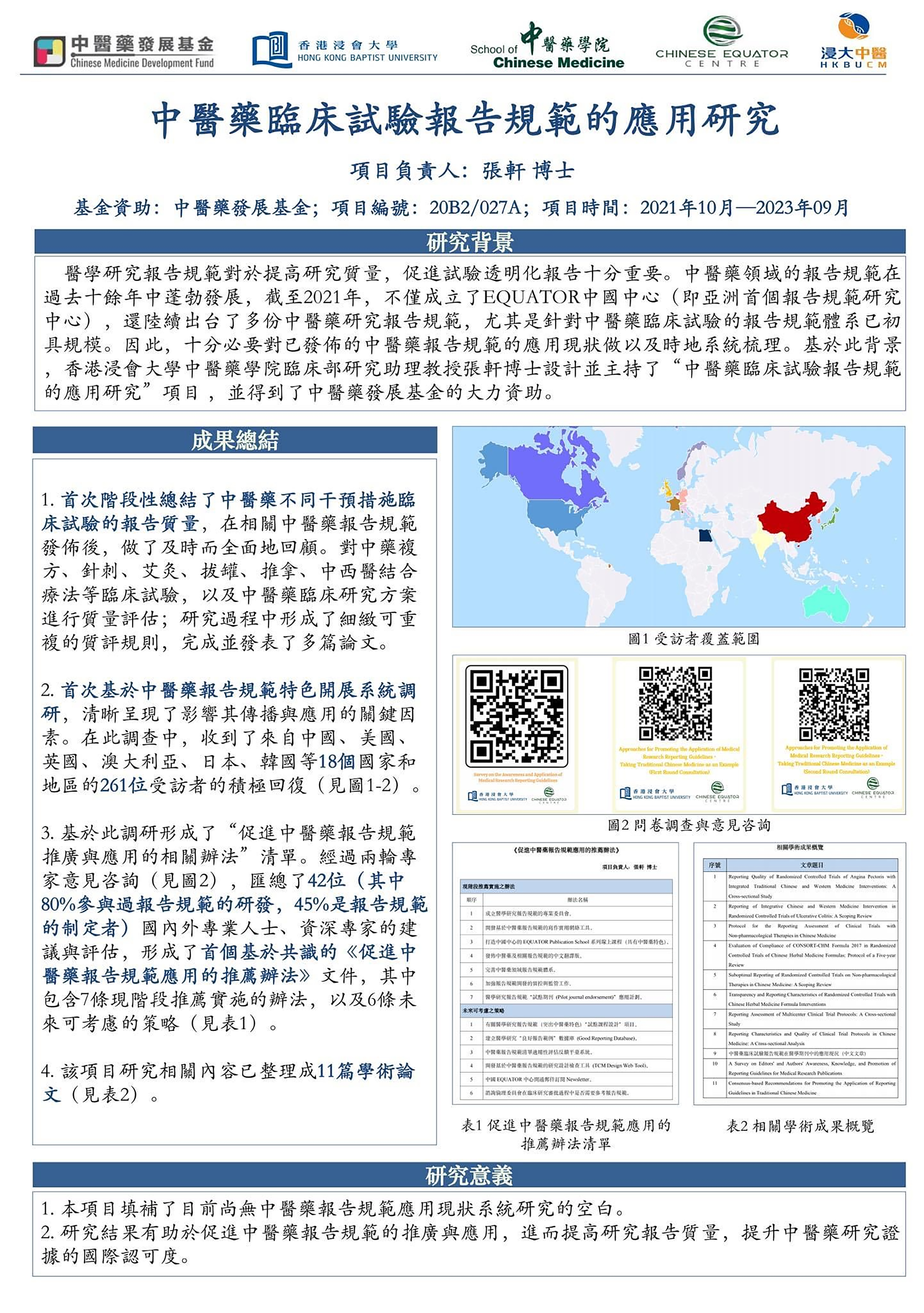 小結:本項目通過系統地文獻研究與問卷調查,階段性回顧總結了中醫藥報告規範的應用情況及現存問題,並基於專家意見形成推廣策略;旨在促進中醫藥報告規範的實施與應用,提高臨床試驗的透明度和報告質量,提升中醫藥臨床研究證據的國際認可度。該項目研究相關結果已整理成11篇學術論文(詳見項目論文匯編冊),其中部分已經在《Journal of Evidence-Based Medicine》,《BMC Medical Research Methodology》、《Frontiers in Pharmacology》等國際期刊上發表。