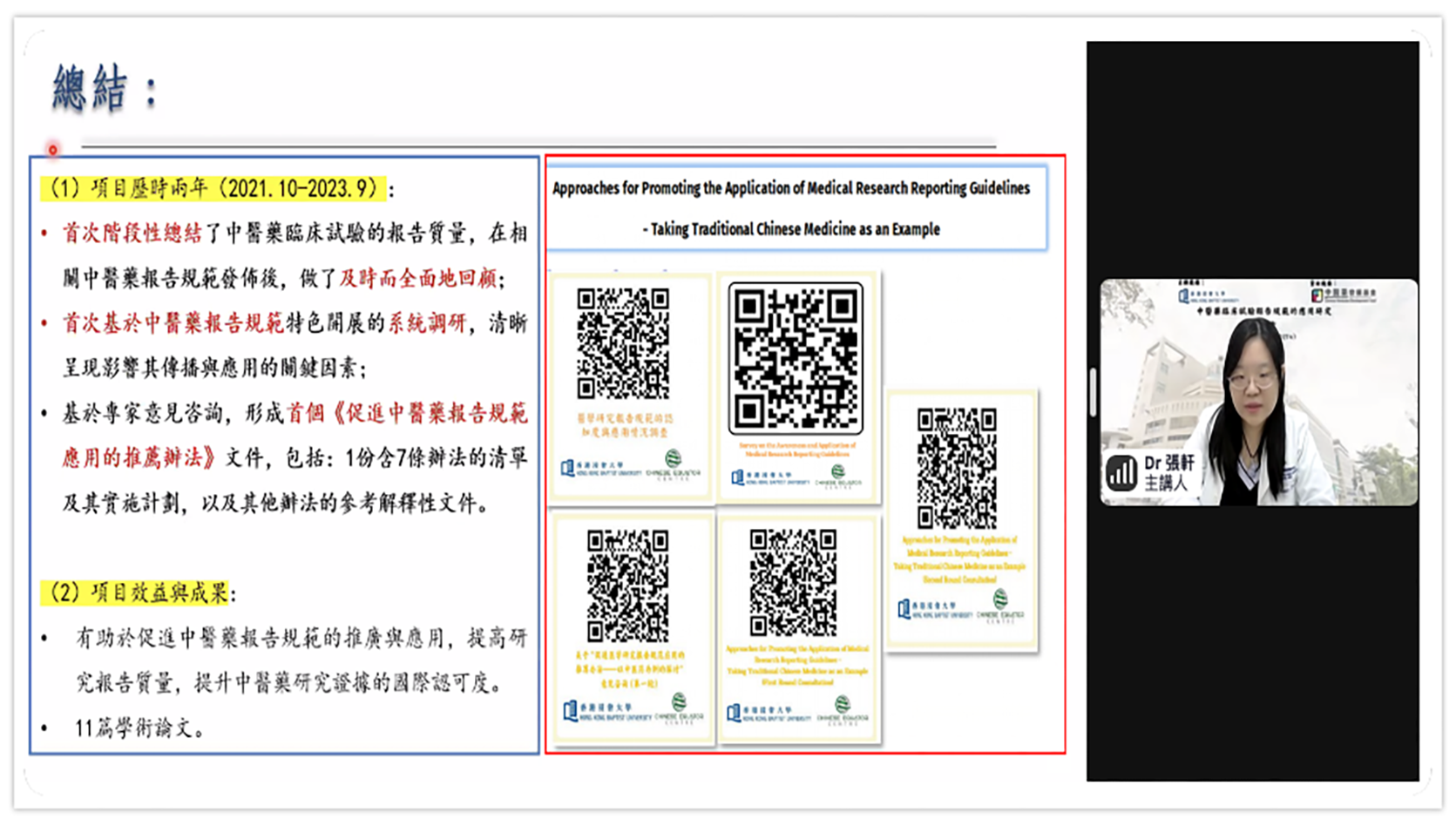 該項目歷時2年(2021.10.1-2023.9.30),按時完成了計劃書中的所有內容。本研究的實施不僅填補了目前尚無中醫藥報告規範應用現狀系統研究的空白,更有利於促進中醫藥臨床研究證據的質量提高,提升中醫藥國際認可度。在2023年9月的發佈會上,項目負責人詳細介紹了本研究的具體內容與重要結果,並設有問答環節。參會人員對項目細節非常感興趣,特別針對非藥物療法的報告特點,報告規範研發的專家團隊遴選,報告規範的投稿使用,以及如何促進中醫藥報告規範應用等具體內容進行了提問,反映中醫藥業界、學界對如何提高中醫研究質量的高度關注。
